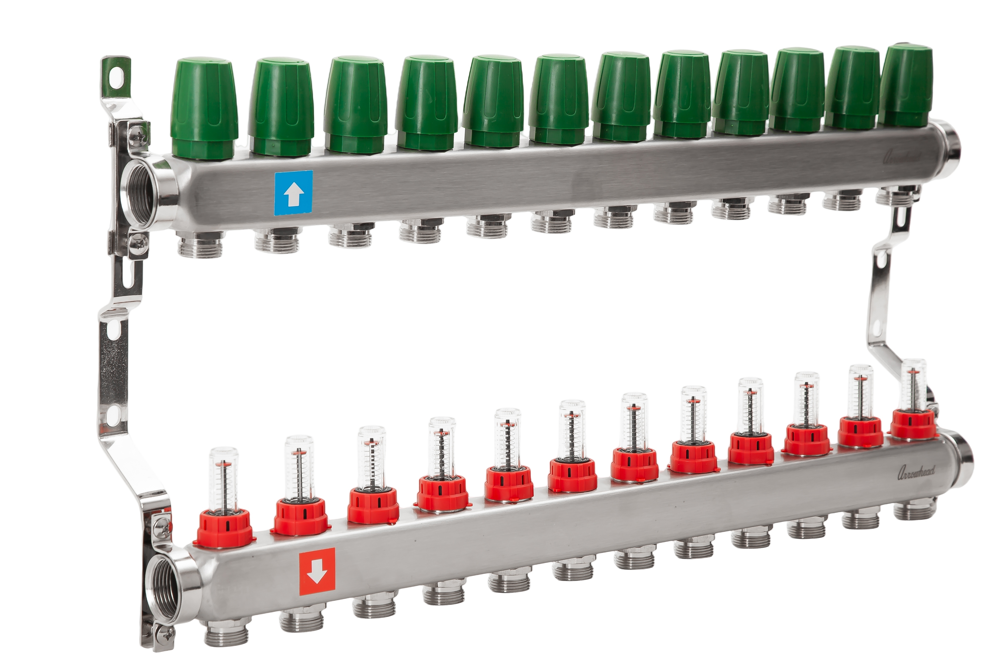 Коллекторные группы из нержавеющей стали ARROWHEAD используются для распределения и регулирования по потребителям теплоносителя в системах радиаторного и напольного отопления.